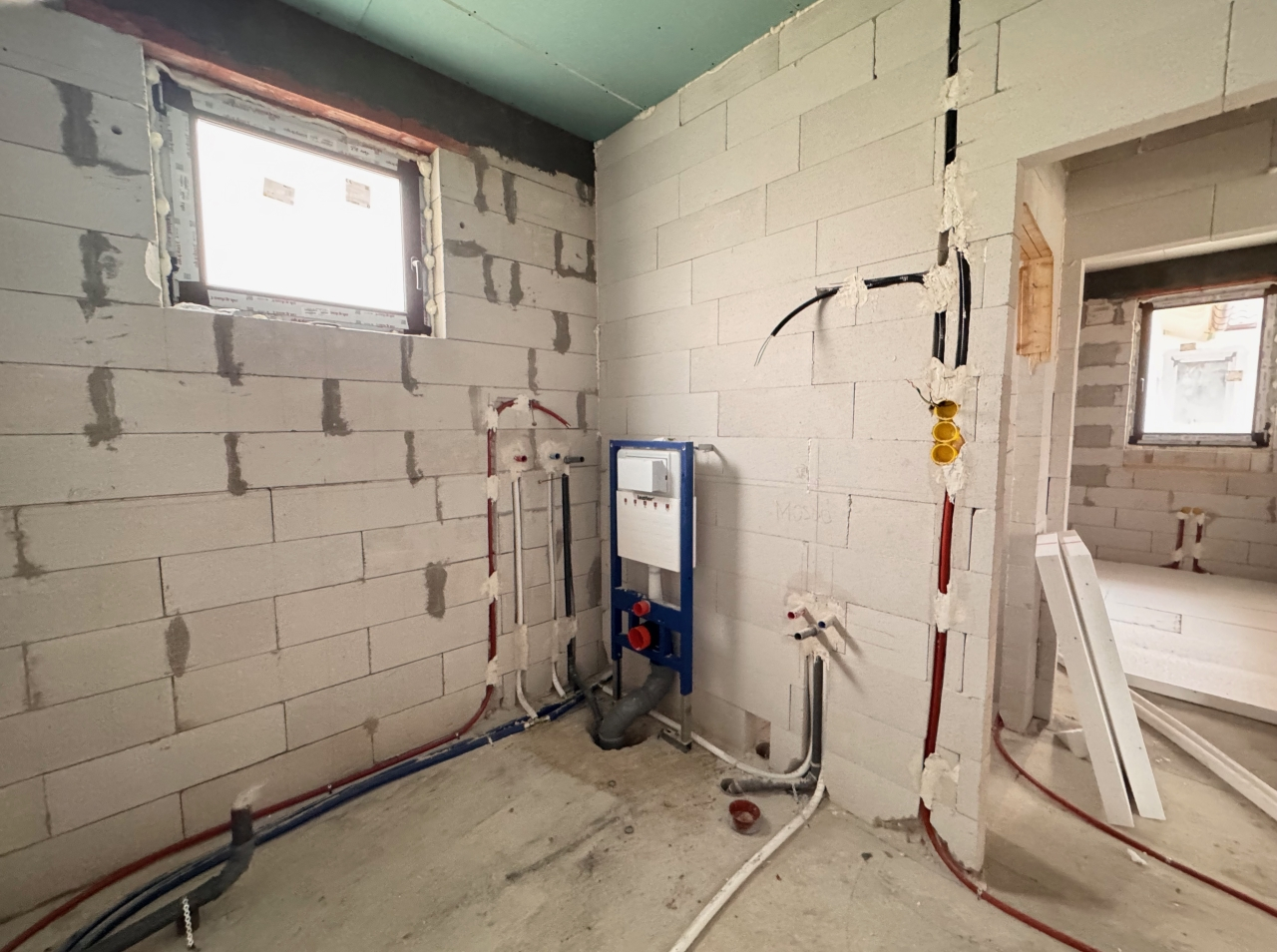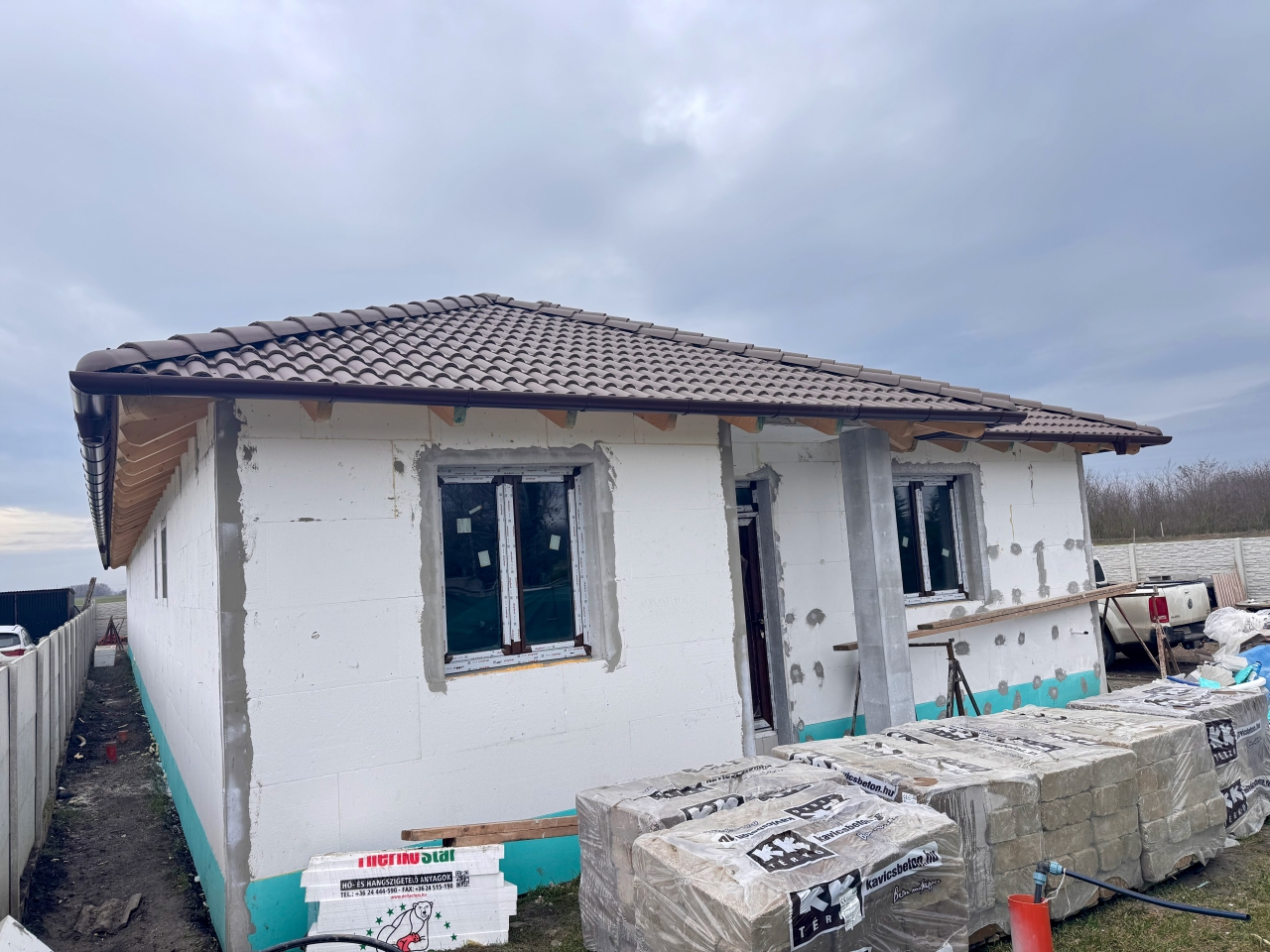 Külső falazat: Ytong 30 cm-es, 12 cm-es Dryvit hőszigeteléssel, 20 cm-es cellulóz alapú fújt födém szigeteléssel.