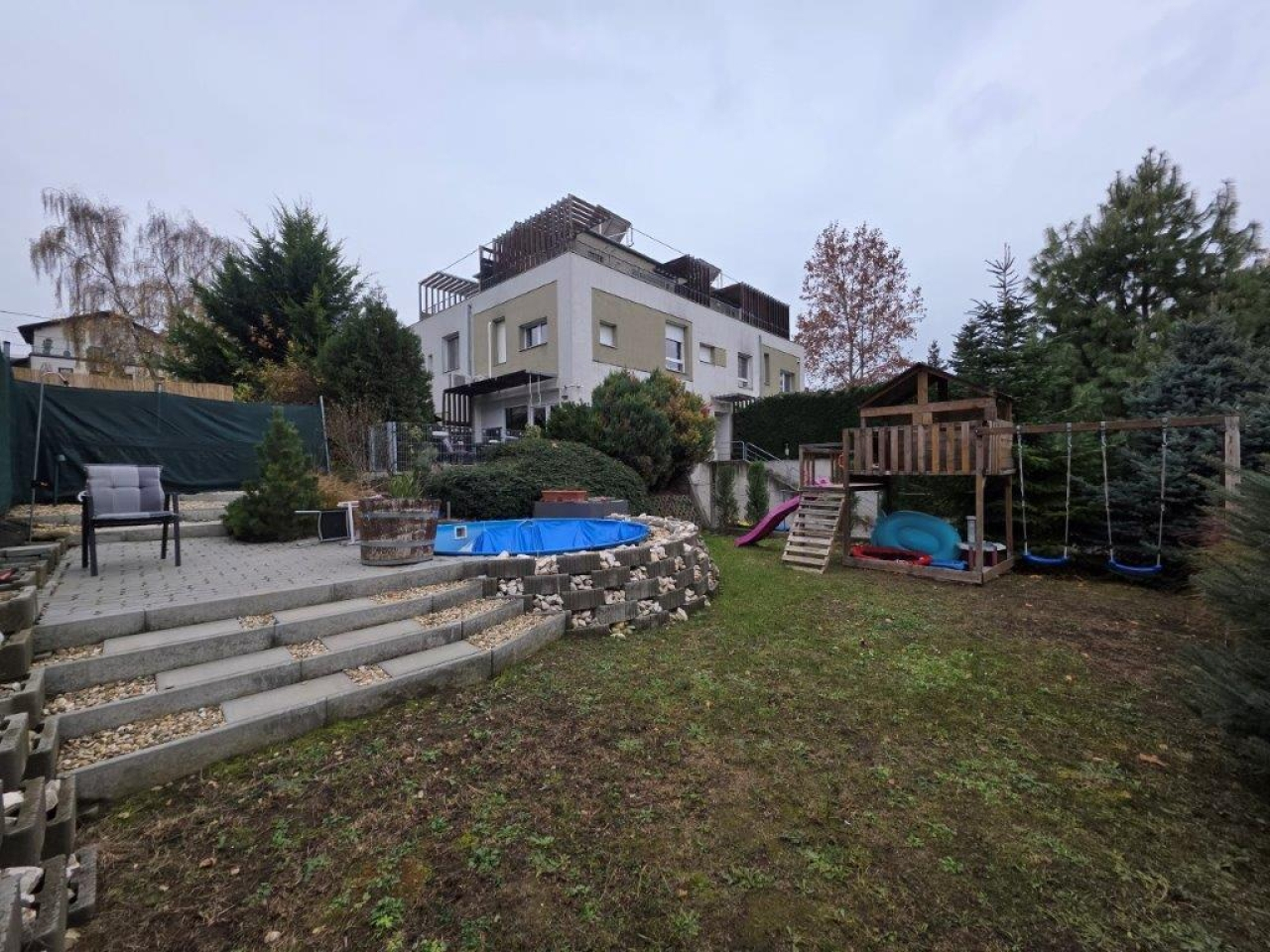 A saját telken medencével, kerti játszóvárral és kerti tárolóval!