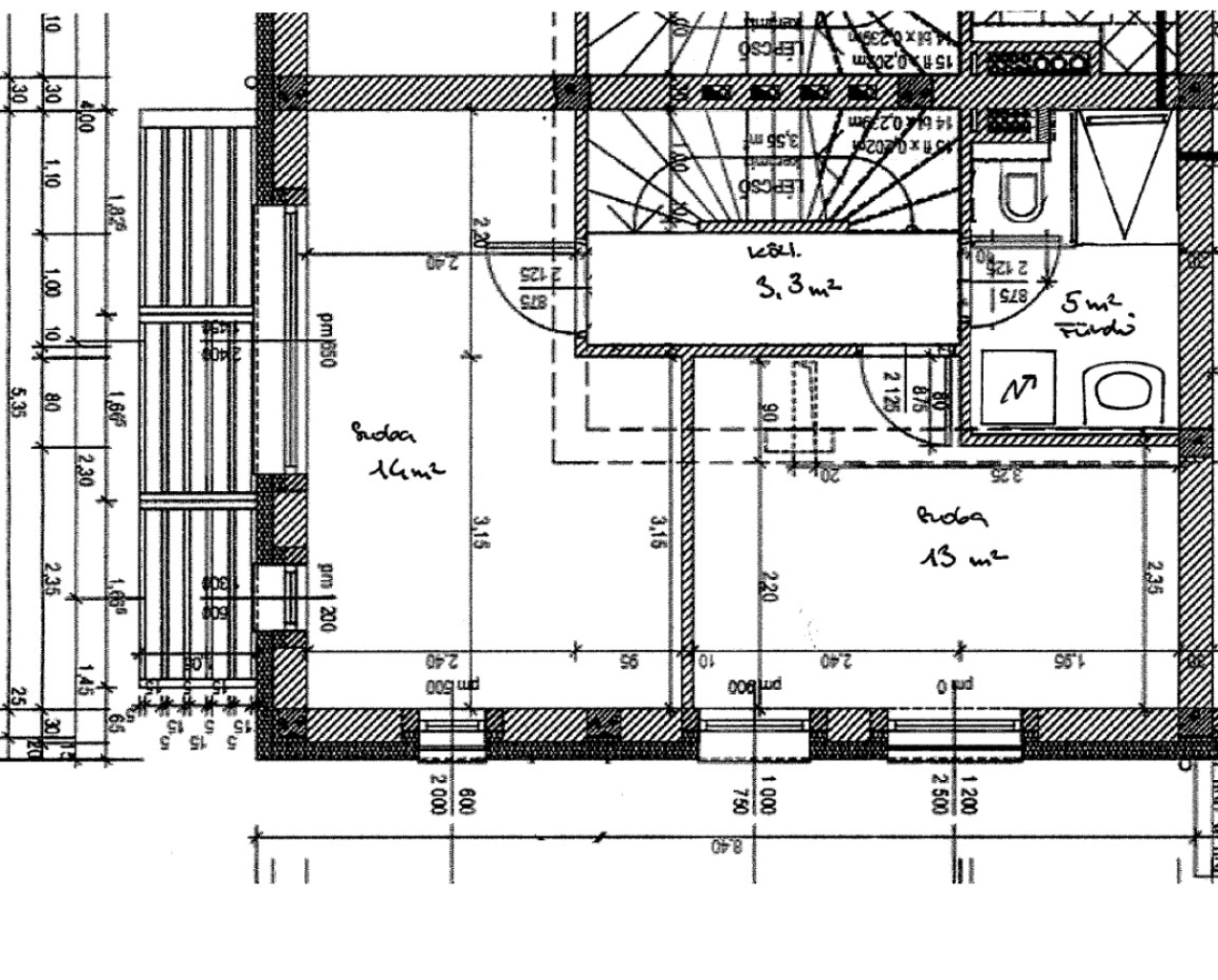 - felső szint: 2 db. szoba, fürdőszoba ( kád, wc, mosdó )