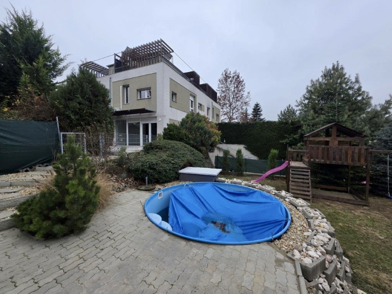 A saját telken medencével, kerti játszóvárral és kerti tárolóval!