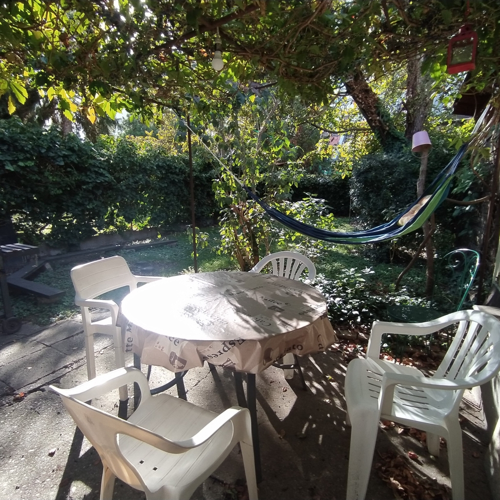 füvesitett 200m2-es saját kert szomszédoktól szeparált, árnyékot adó diófával, pergolával, kerti sütő hellyel rendelkezik.