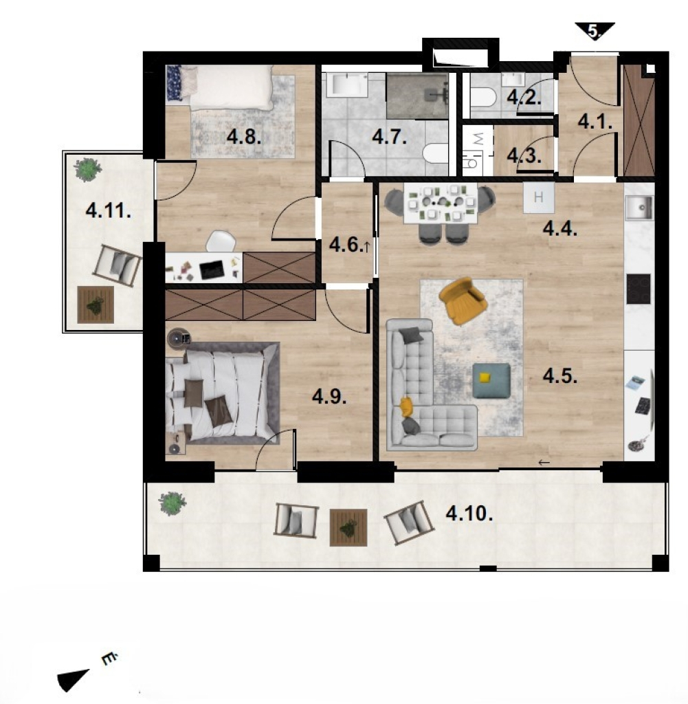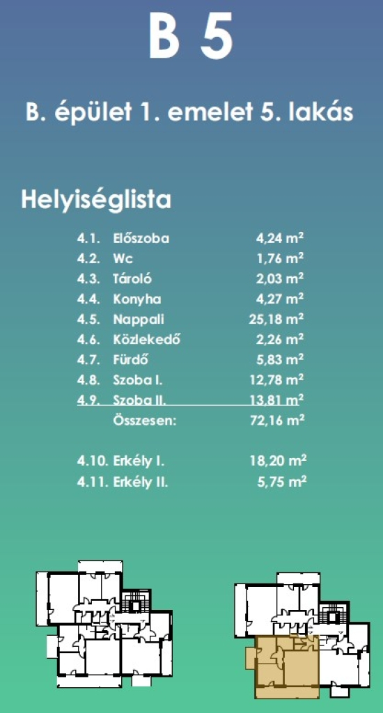 49, 54, 71, 80 nm2 méretű ingatlanok közül lehet választani. Földszinti lakások saját terasszal és kertrésszel míg az 1. és 2. emeleti lakások nagy teraszokkal rendelkeznek.