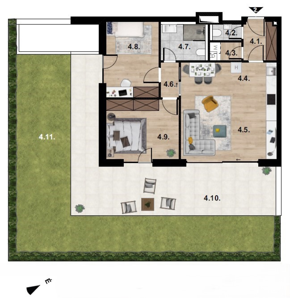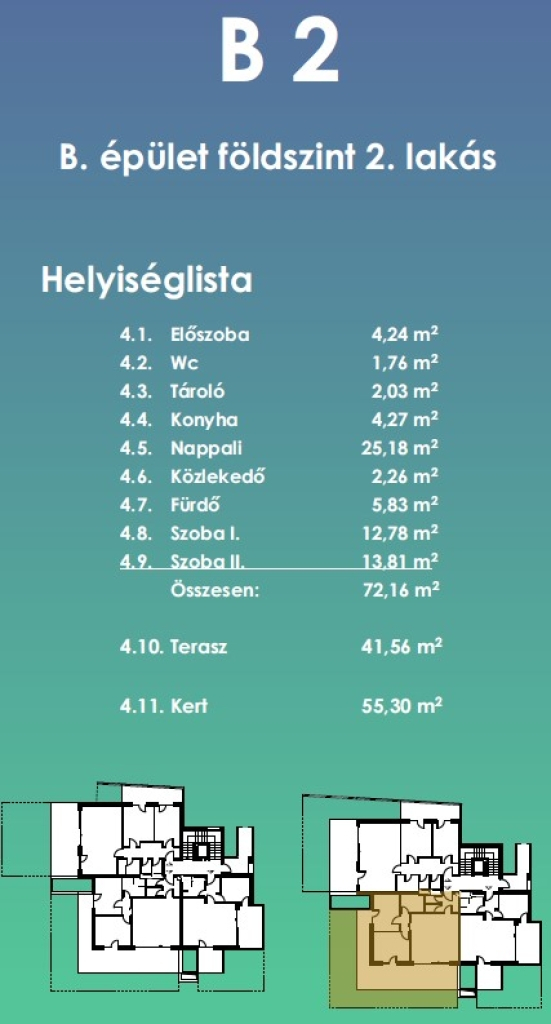 49, 54, 71, 80 nm2 méretű ingatlanok közül lehet választani. Földszinti lakások saját terasszal és kertrésszel míg az 1. és 2. emeleti lakások nagy teraszokkal rendelkeznek.