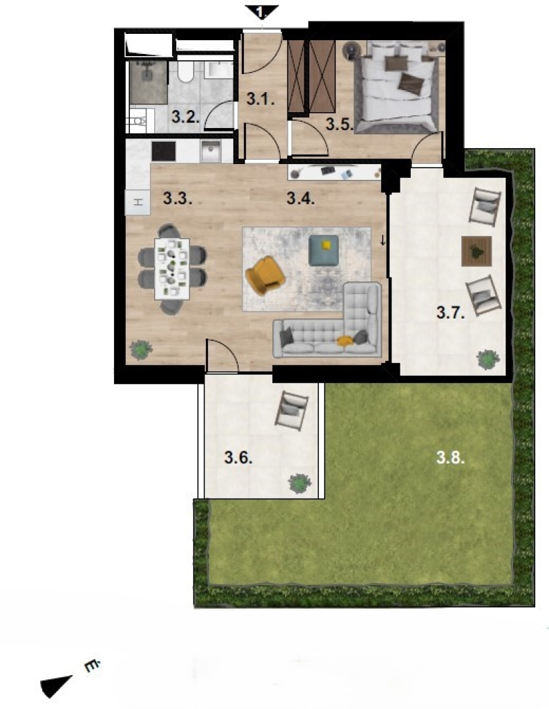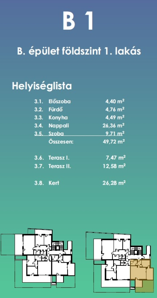 49, 54, 71, 80 nm2 méretű ingatlanok közül lehet választani. Földszinti lakások saját terasszal és kertrésszel míg az 1. és 2. emeleti lakások nagy teraszokkal rendelkeznek.