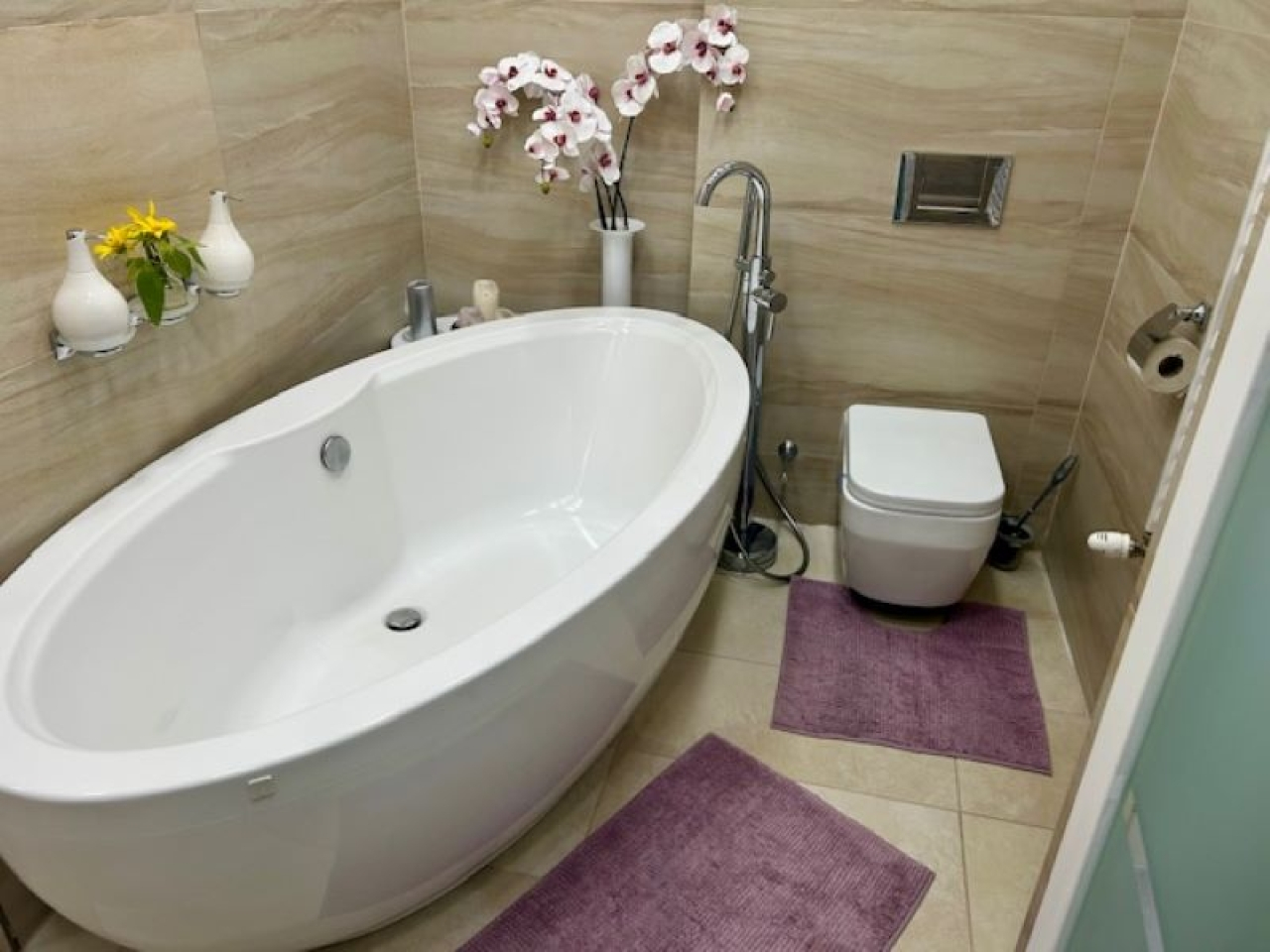 A fürdőszoba igazi különlegesség: hatalmas ovális káddal és különálló szaunával rendelkezik, prémium burkolatokkal és szaniterekkel.