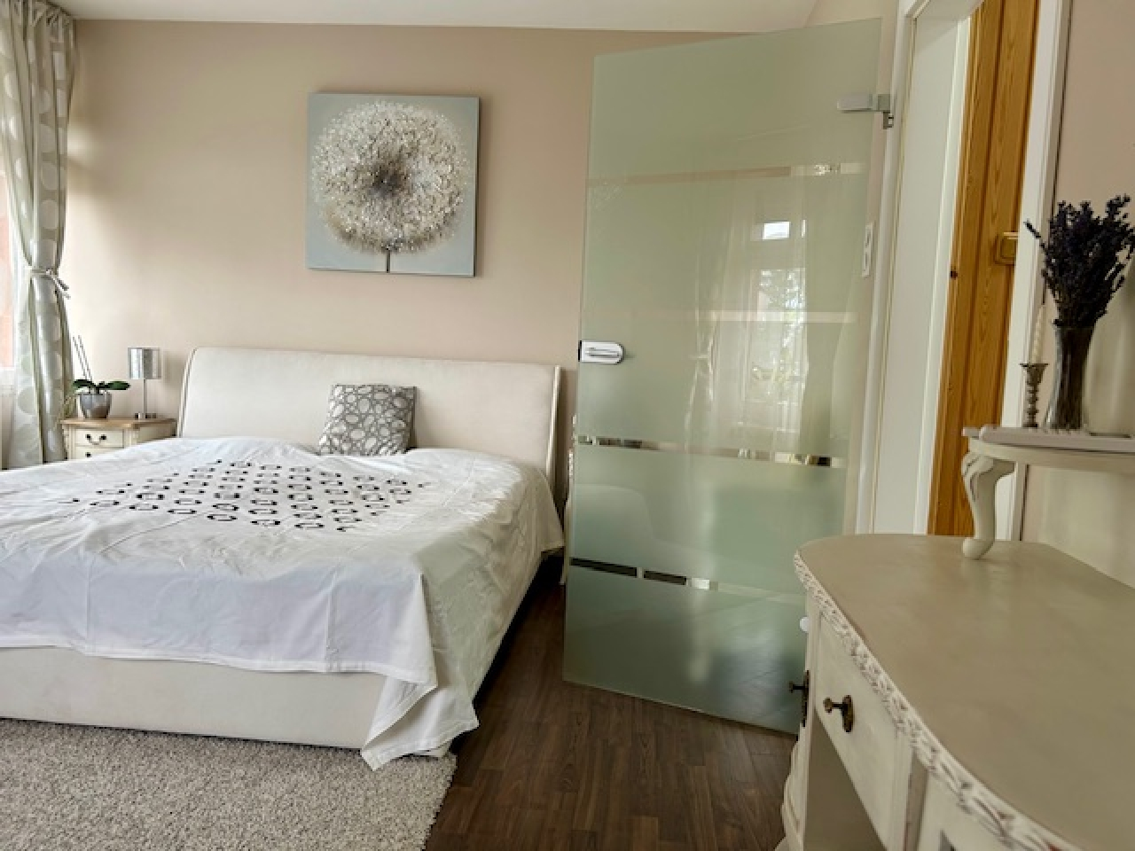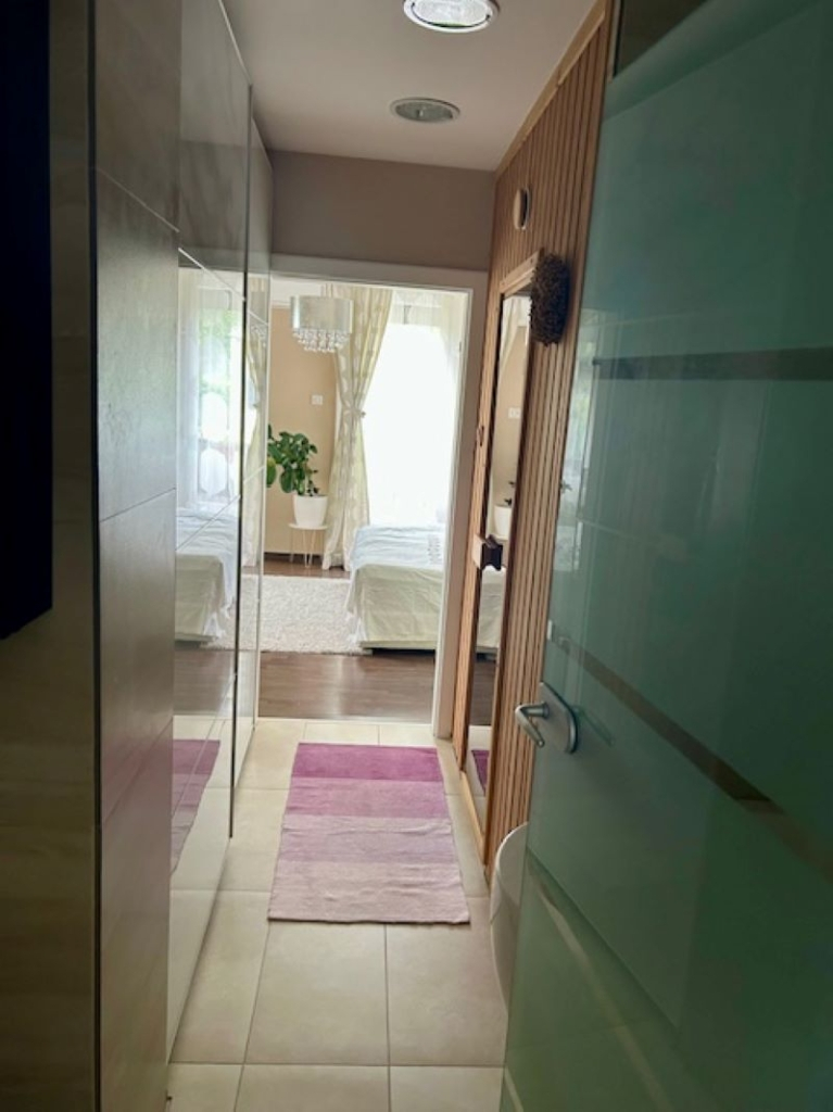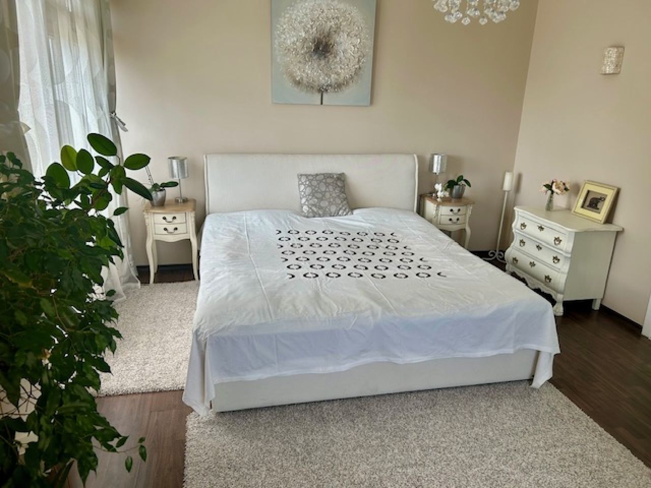 A hálószoba (18 m²) elegáns bútorokkal és nagy gardróbszekrénnyel felszerelt, így tökéletes kényelmet biztosít.
