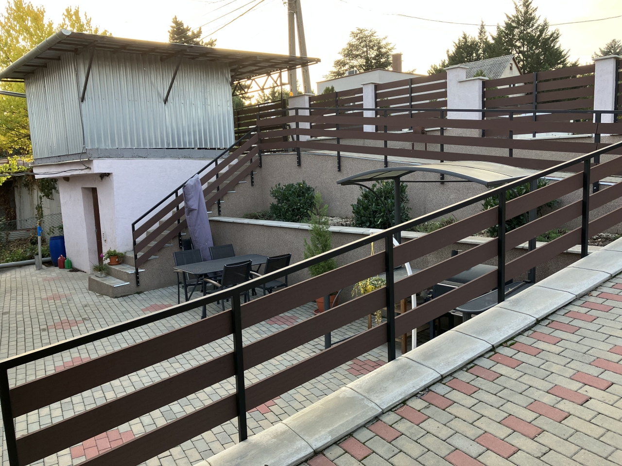A nappaliból egy 15 m²-es, fedett teraszra léphetünk ki, amely az intim, zöld környezetnek köszönhetően ideális pihenésre és baráti összejövetelekre.
