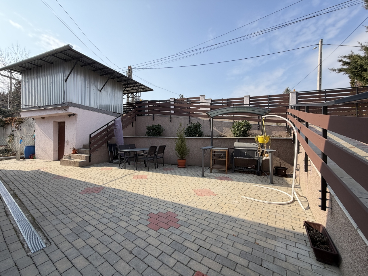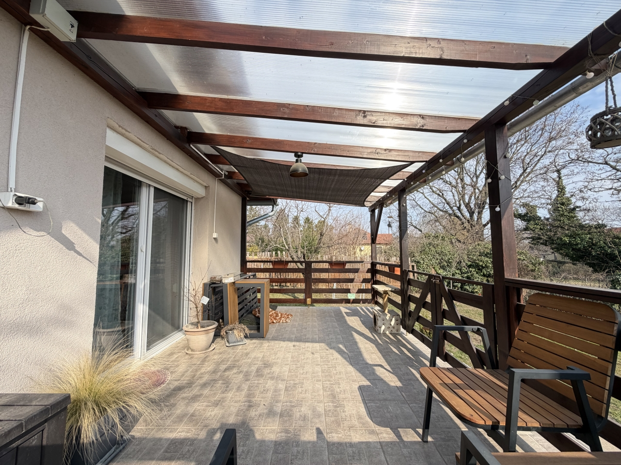 A nappaliból egy 15 m²-es, fedett teraszra léphetünk ki, amely az intim, zöld környezetnek köszönhetően ideális pihenésre és baráti összejövetelekre.