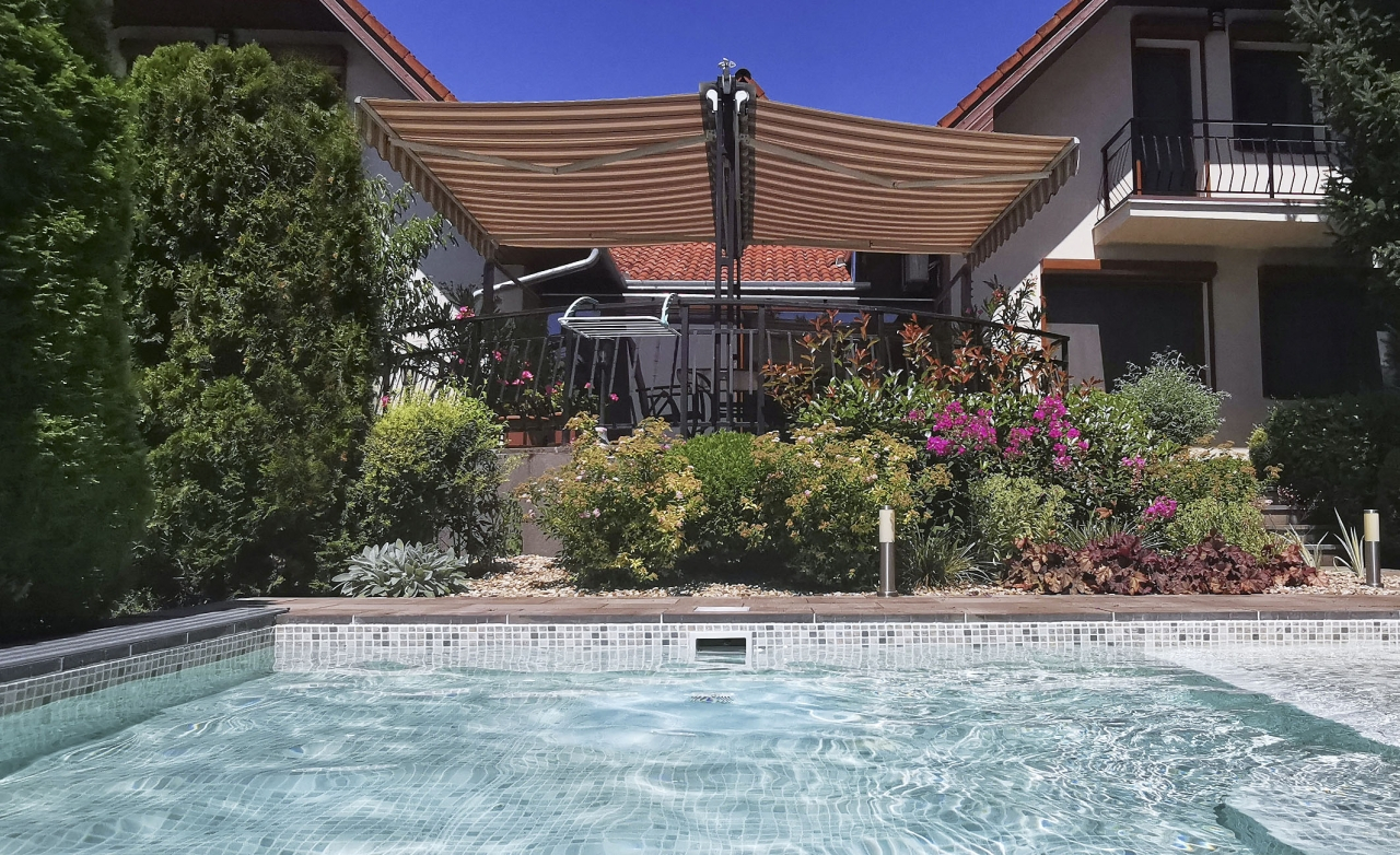 - 5 kW-Solaranlage auf der Garage und Solarpaneele am Haus zur Unterstützung der Poolheizung und der Warmwasserversorgung,