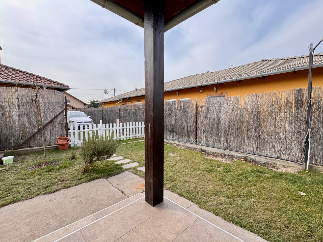 Az eladó ingatlan az utcáról nézve a telek hátsó részén helyezkedik el.