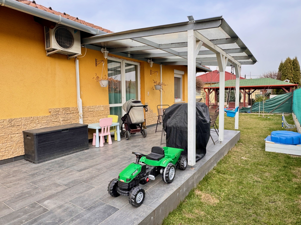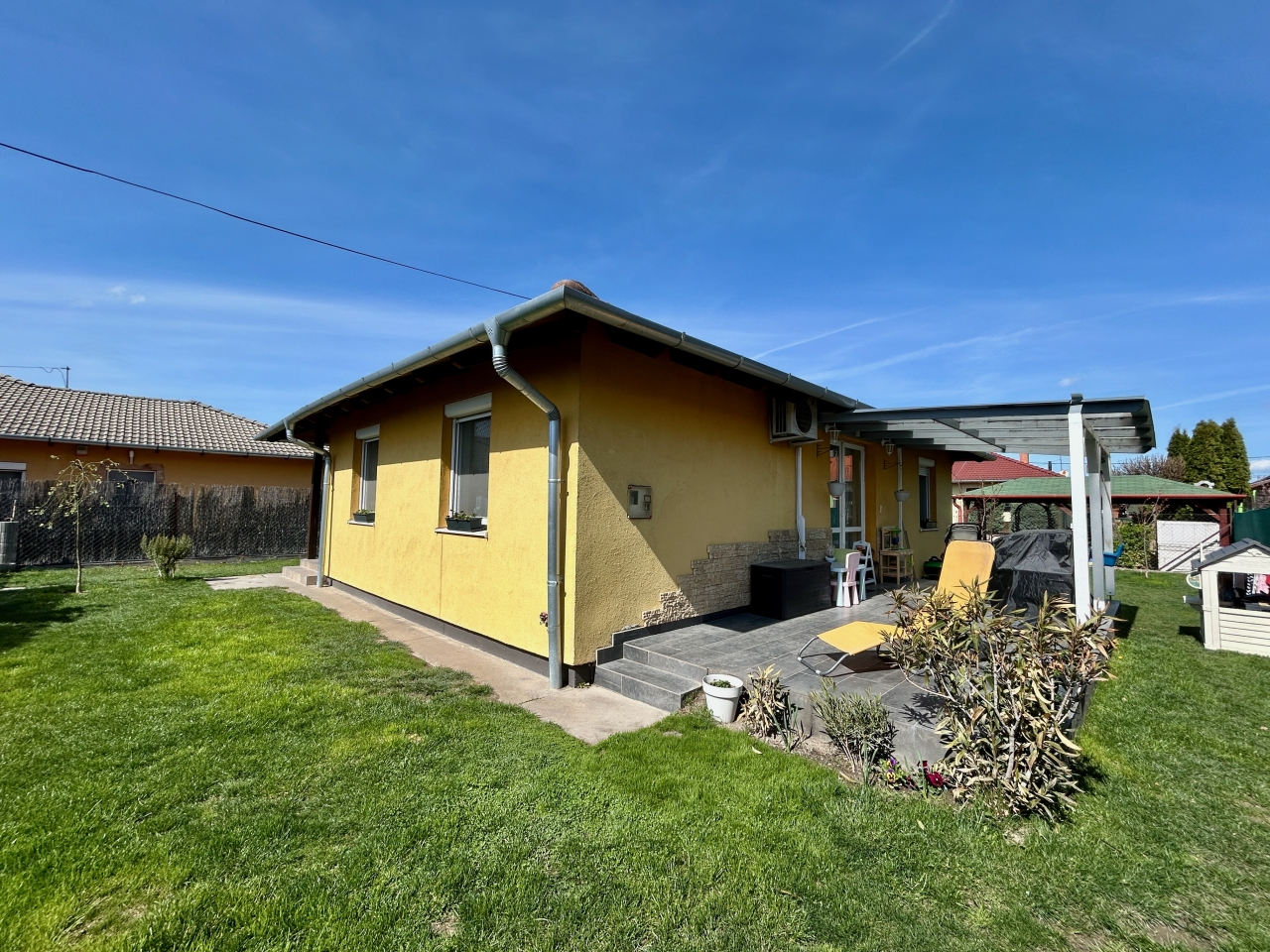 További információk: 1 db. inverteres Daikin klíma, redőny és szúnyoghálóval kiépítve, öntöző rendszer, fedett terasz, gépesített konyhával (az ár tartalmazza).