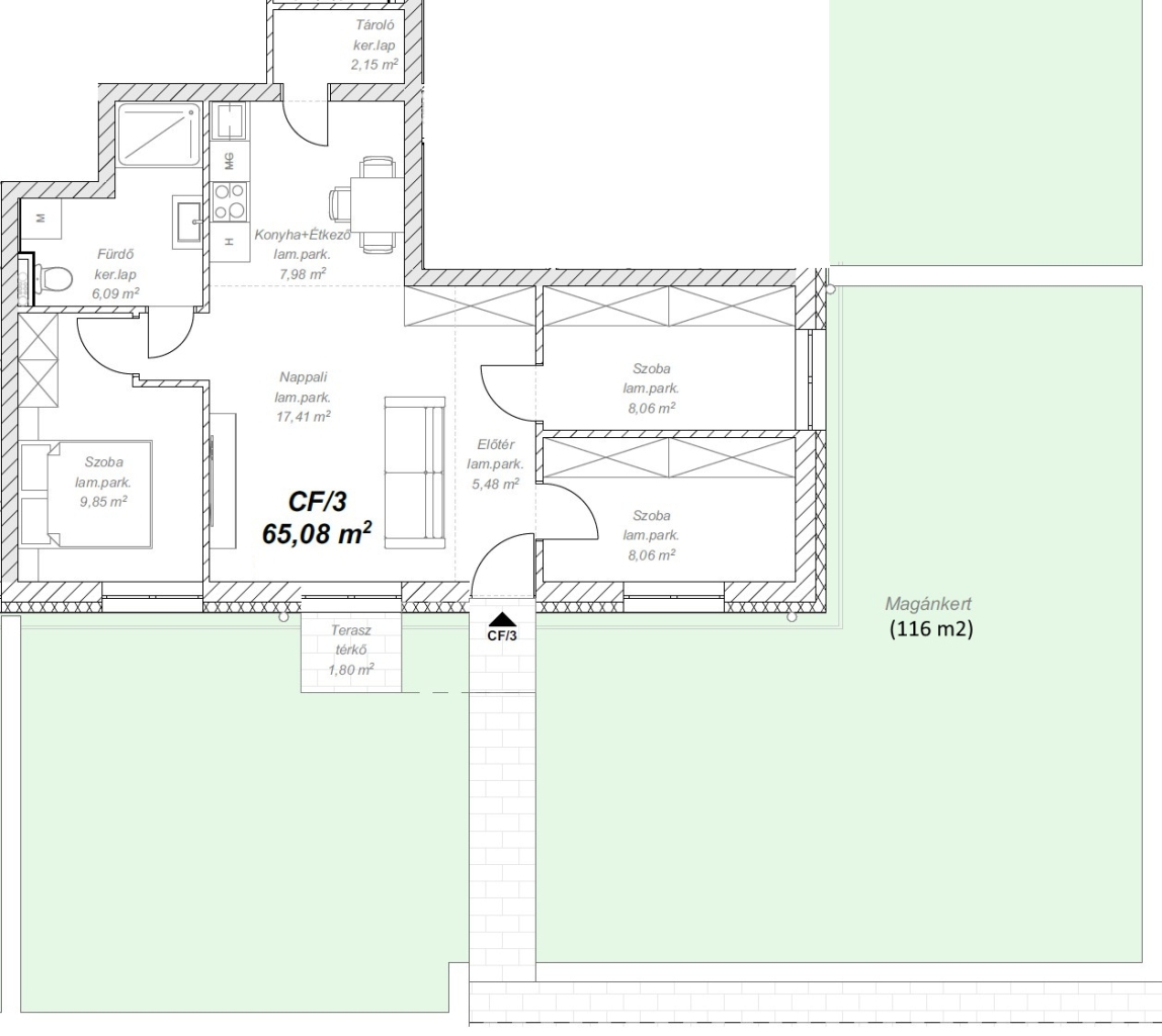 Mendén csodálatos zöld környezetben a Hétdomb lakóparkban, I. ütem második szakaszában megvalósuló új építésű zárt lakóparkban, A. kategóriás energiatakarékos ( hőszivattyús ) 16 lakásos társasházban, nettó hasznos 65,08 m² alapterületű, FÖLDSZINTI kertkapcsolatos lakást, SAJÁT 116 m² KERTRÉSSZEL kínálunk eladásra (C épület Földszint 3. Lakás).