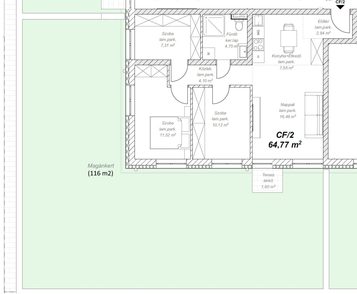Mendén csodálatos zöld környezetben a Hétdomb lakóparkban, I. ütem második szakaszában megvalósuló új építésű zárt lakóparkban, A. kategóriás energiatakarékos ( hőszivattyús ) 16 lakásos társasházban, nettó hasznos 64,77 m² alapterületű, FÖLDSZINTI kertkapcsolatos lakást, SAJÁT 116 m² KERTRÉSSZEL kínálunk eladásra (C épület Földszint 2. Lakás).