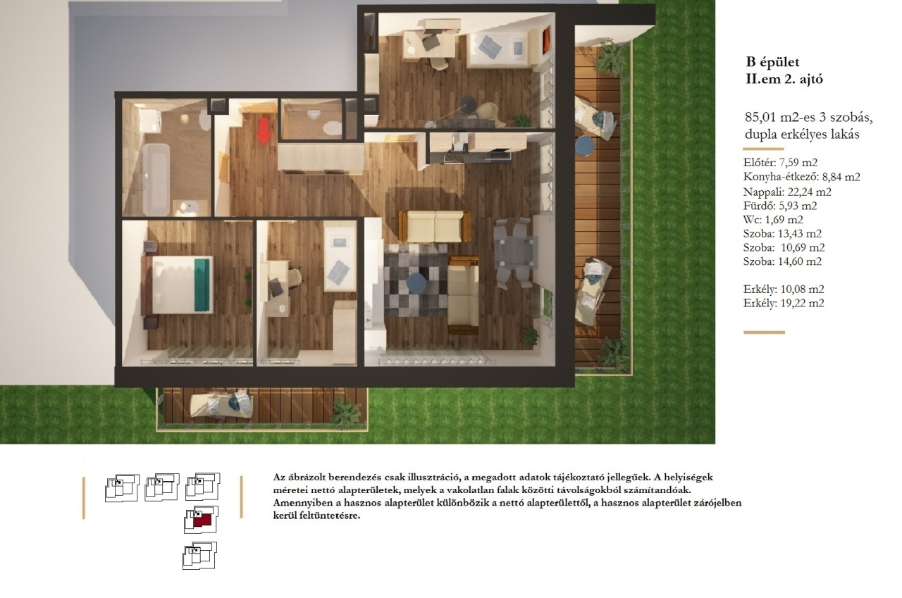 Szigetszentmiklós-Lakihegyen új építésű exkluzív lakóparkban, az I. ütemben megvalósult “B” LIFTES épületben kínálunk eladásra, egy II. ( legfelső ) emeleti nettó hasznos 85,01 m² lakóterületű nappali + 3 szobás ÚJSZERŰ lakást, DUPLA ERKÉLLYEL ( 19,22 m² és 10,08 m² ) .