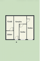 előszoba, hall, melyből két szoba nyílik, étkező, konyha, fürdőszoba