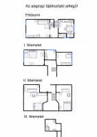 - Földszint: előtér-lépcsőház(11,2m2), nappali(23,43m2), konyha (12,5m2), WC(1,8m2), terasz