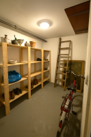 A ház lépcsőháza átriumos belső zárt udvarral, örökzöldekkel kialakított, belső lejárattal a teremgarázsokhoz és a tárolóhoz.