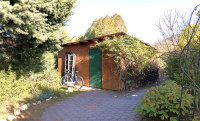 - füvesített kert örökzöldekkel, gyümölcsfákkal, kerti kisházzal.