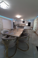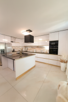 A teraszon áthaladva a látogató egy tágas nappaliba érkezik, amely étkezővel és modern amerikai konyhával van kialakítva.