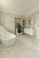 A ház ideális nagycsaládosok számára is, hiszen a 150 m²-es lakótérben két nagy hálószoba található, közvetlenül mellettük fürdőszobákkal, WC-vel és gardróbszobákkal.