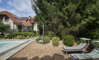 -garázson 5 KW-os napelem, a házra pedig napkollektorok kerültek felszerelésre, besegítve a medence fűtését és a készenléti melegvíz ellátását,