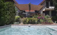 Kertben öntöző rendszer telepített, örökzöld növényekkel parkosított, melyben egy fedett, fűthető úszómedence található.