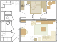 előszoba(6,4m2), gardrób(2,35m2), fürdőszoba(2,4m2), WC.(0,7m2), konyha(5m2), kamra(0,55m2), nappali(16,87m2), hálószoba(12,63m2), loggia(3,96m2)