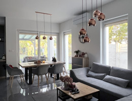 Az épület elrendezése átgondolt és élhető, a földszinten csak a garázsnál érintkezik a szomszéddal, az emeleten pedig mindössze két hálószobánál van a kapcsolódási pont.