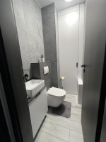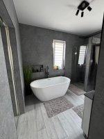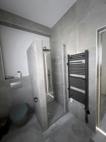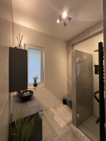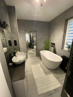 Az alaprajzhoz képest az emeleten a szülői hálószobából egy elegáns tükör tolóajtón keresztül közvetlenül is megközelíthető a fenti fürdőszoba, amely szintén prémium érzetet ad ennek a helyiségnek is.